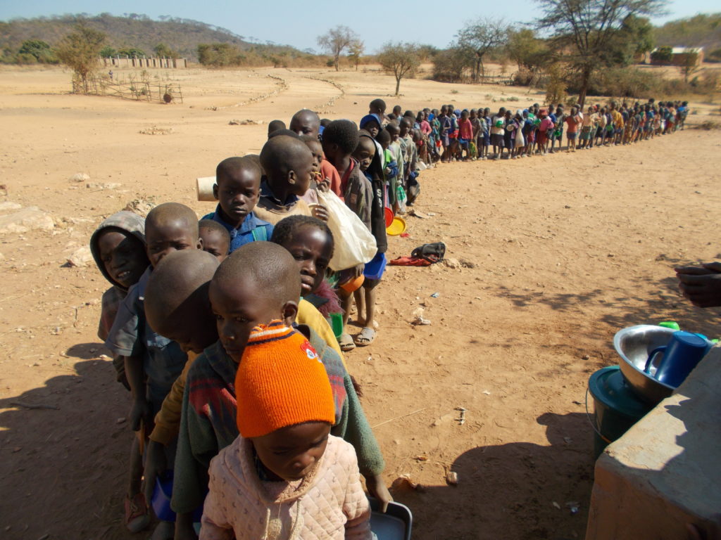 Children line up for the food program supported by Fredrik and Derek.Children walking to the school built from Fredrik and Derek.